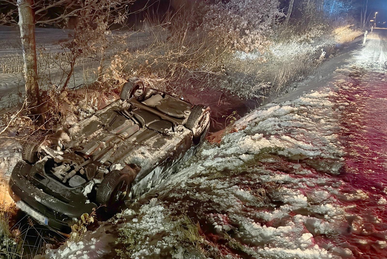 Der verunglückte Wagen lag kopfüber im Graben. © Geiken / Feuerwehr Aurich