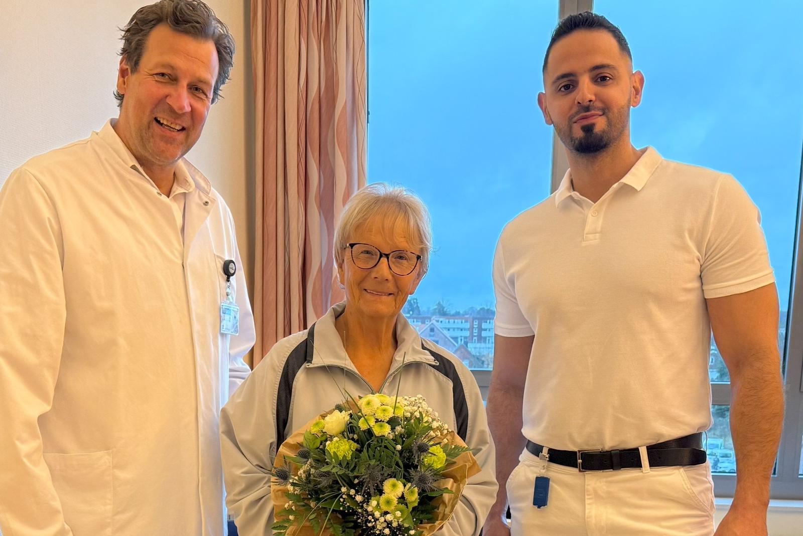 Dr. med. Philipp Werner (Chefarzt der Klinik für Orthopädie/Unfallchirurgie), Patientin Dore Büürma und Mohannad Alsulaiman (Oberarzt der Klinik für Orthopädie/Unfallchirurgie). © Klinikum