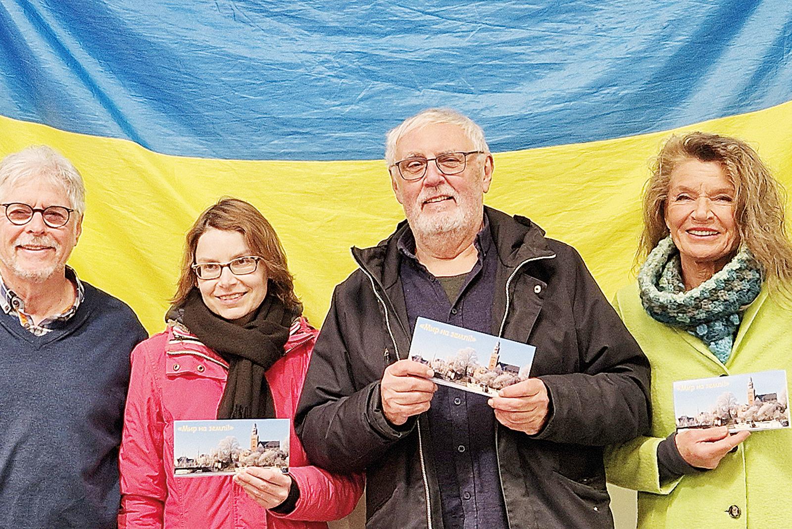 Sie sind aktiv bei der Initiative »Leer hilft Mykolajiw« (von links): Martin Heimbucher, Marieke Kimmich, Bruno Schachner und Beate Stammwitz mit der Spenden-Grußkarte.  © Foto: privat