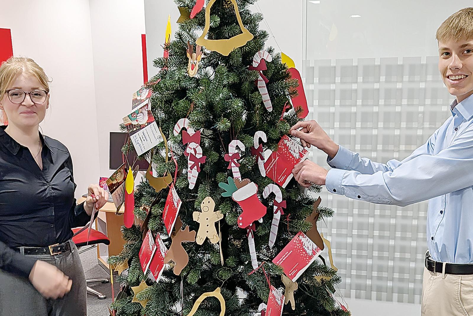 Auftakt für die Aktion »Weeneraner Bürger beschenken bedürftige Kinder«: In der Sparkasse an der Marktstraße in Weener ist nun der Tannenbaum mit den Wunschkarten geschmückt worden. Fiona Smidt und Ted Sanders von der Sparkasse LeerWittmund ü...