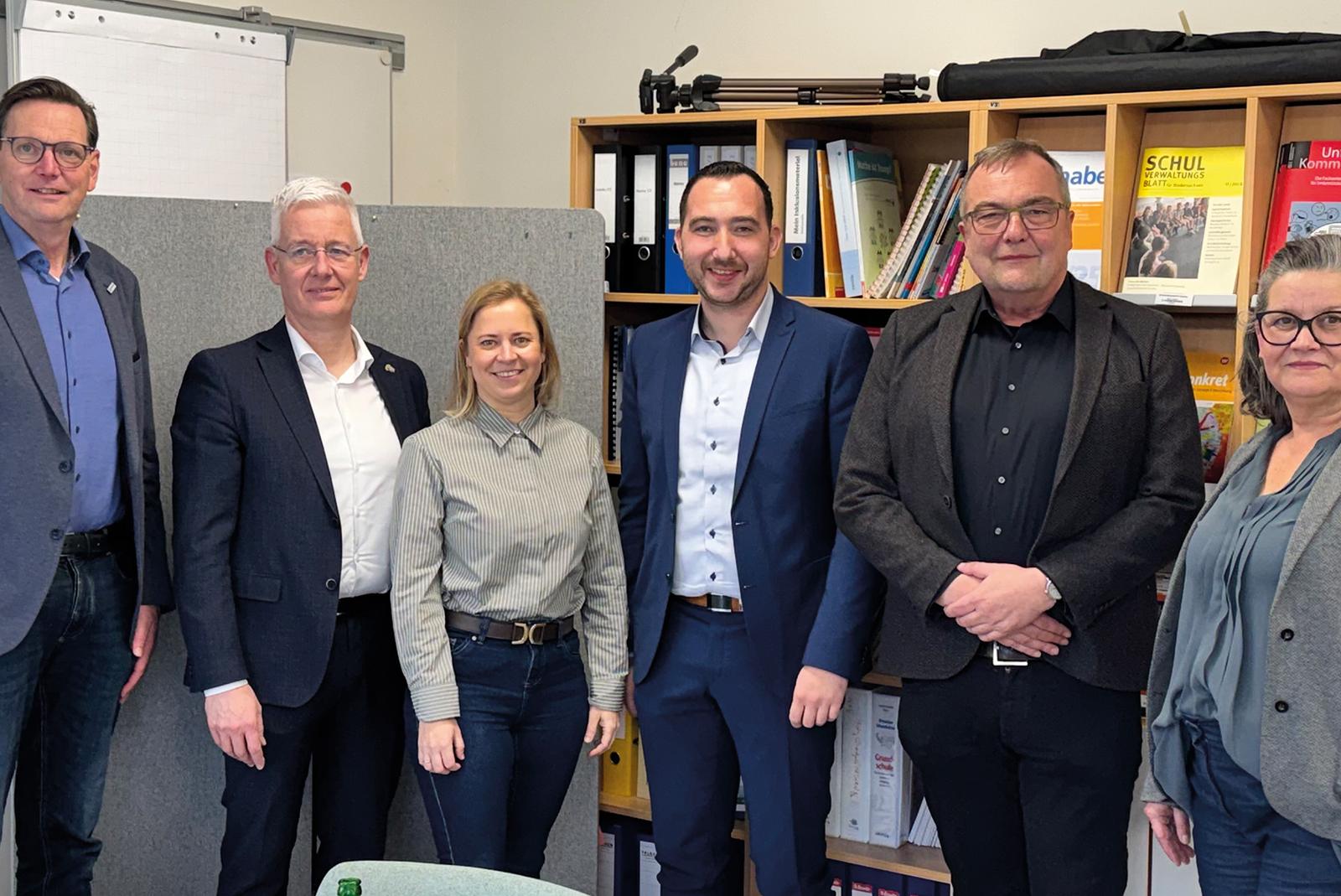 Nach dem Gespräch (von links nach rechts): Erwin Koops, Geschäftsführer der Lebenshilfe, Landrat Matthias Groote, die bildungspolitische Sprecherin der SPD-Landtagsfraktion, Kirsikka Lansmann, und der SPD-Landtagsabgeordnete Nico Bloem, Heiko Höfelmann, Bereichsleiter des Kinder- und Jugendbereiches der Lebenshilfe, sowie Meike Arends, Leiterin der Tagesbildungsstätte in Leer. © Foto: Schröder