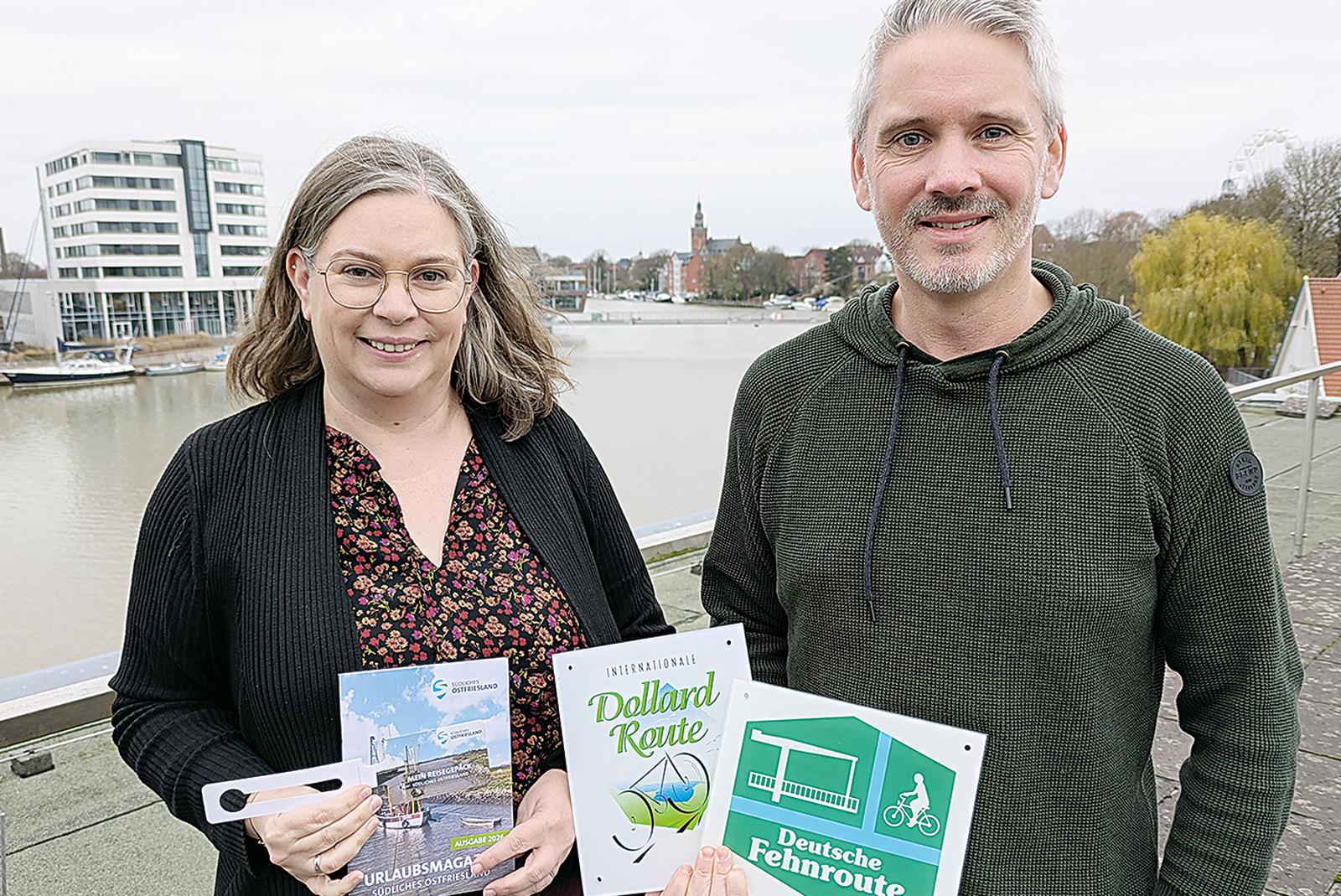 Insa Wutschke, Geschäftsführerin der Touristik GmbH »Südliches Ostfriesland«, und Ulrich Schmunkamp, Geschäftsführer der Vereine »Internationale Dollard Route« und »Deutsche Fehnroute«, auf dem Dach der Tourismuszentrale am Freizeithafen in Leer.  © Foto: Szyska