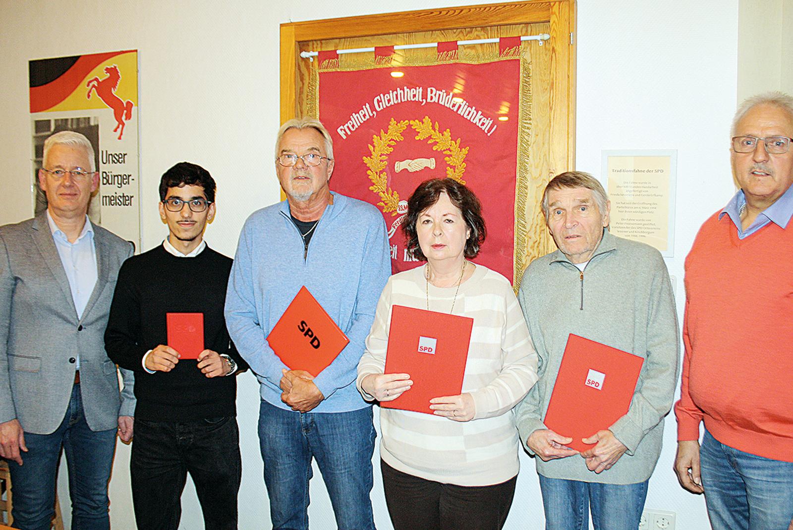 Bei den Ehrungen: Von links Landrat Matthias Groote, Neumitglied Issam Mustafa, Karl-Heinz Schüür (40 Jahre Parteimitglied), Sigrid Gardey und Manfred Gardey (über 20 Jahre Mitglied) und Ortsvereinsvorsitzender Friederich Sap.  © Foto: SPD