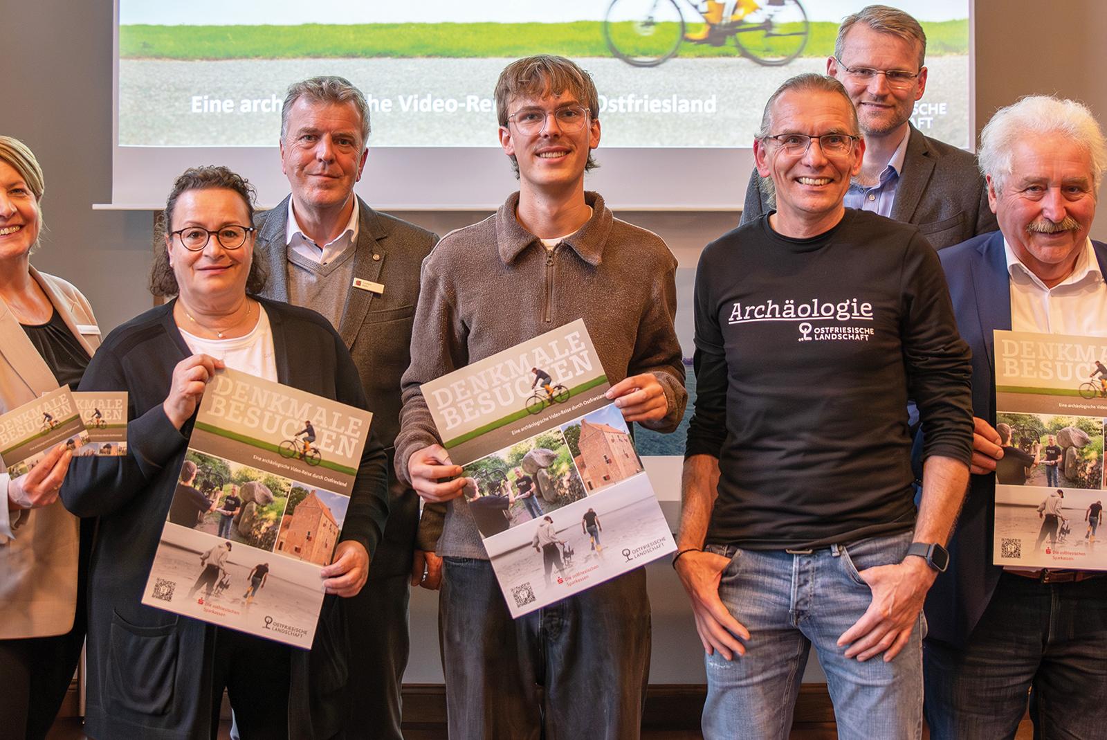 Von links: Insa Bruns-Breninck, Ute Meinert und Carsten Mohr von den ostfriesischen Sparkassen, der Videoproduzent Jannik Preuß, Dr. Jan F. Kegler, Dr. Matthias Stenger und Rico Mecklenburg von der Ostfriesischen Landschaft bei der Vorstellung der Video-Reihe »Denkmale besuchen«.  © Foto: Ostfriesische Landschaft