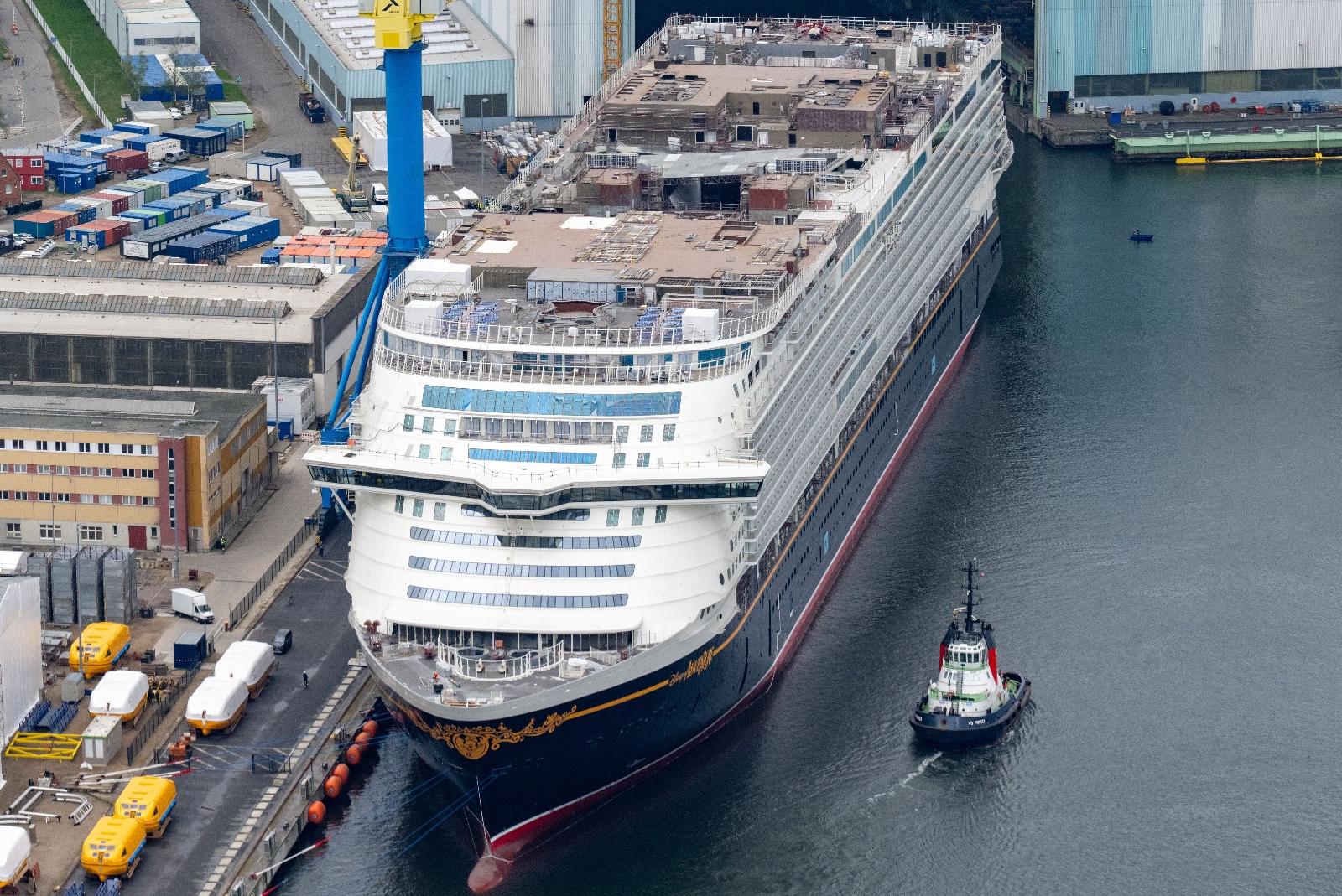 April 2025: Das Kreuzfahrtschiff „Disney Adventure“ liegt nach dem Verlassen der Schiffbauhalle am Ausrüstungskai der Meyer Werft in Wismar. © Foto: Sauer (dpa)