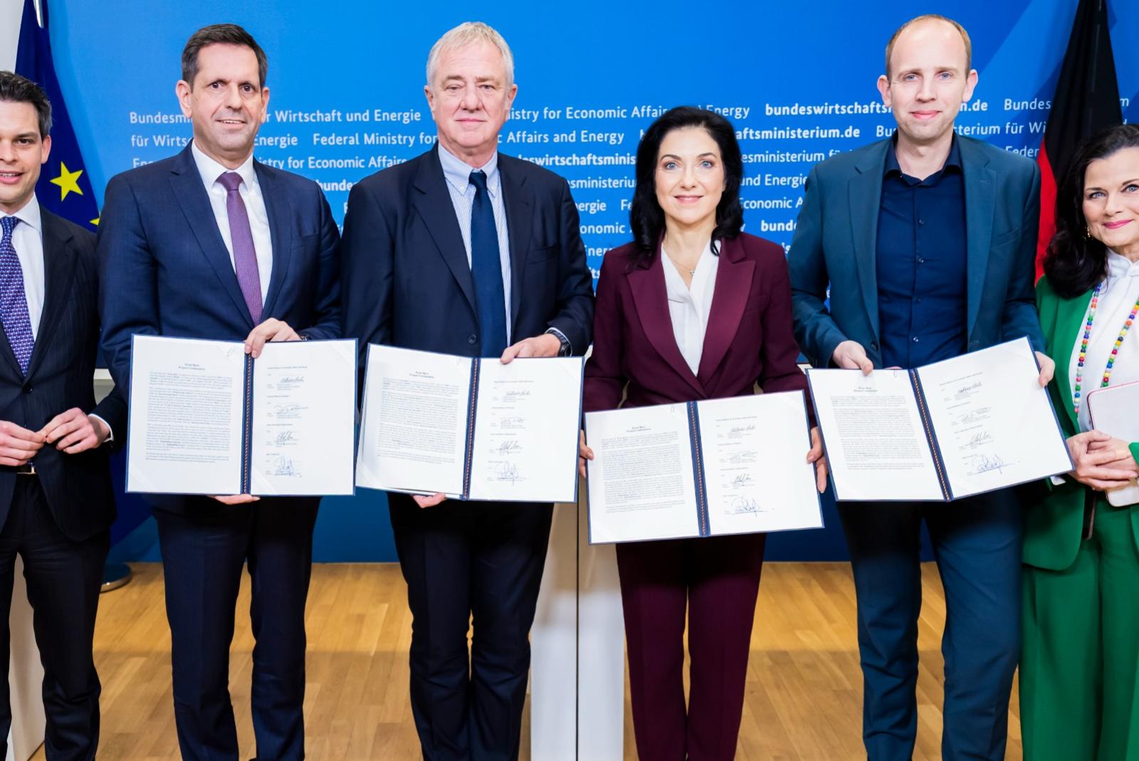 Christoph Ploß (von links), Koordinator der Bundesregierung für maritime Wirtschaft und Tourismus, Olaf Lies (SPD), Ministerpräsident von Niedersachsen, Pierfrancesco Vago, Vorstandsvorsitzender der Reederei MSC Cruises, Katherina Reiche (CDU), Bundesministerin für Wirtschaft und Energie, Dennis Rohde (SPD), Parlamentarischer Staatssekretär im Bundesministerium der Finanzen, und Gitta Connemann (CDU), Parlamentarische Staatssekretärin im Bundesministerium für Wirtschaft und Energie, präsentieren die unterzeichnete Absichtserklärung. © Foto: Soeder (dpa)