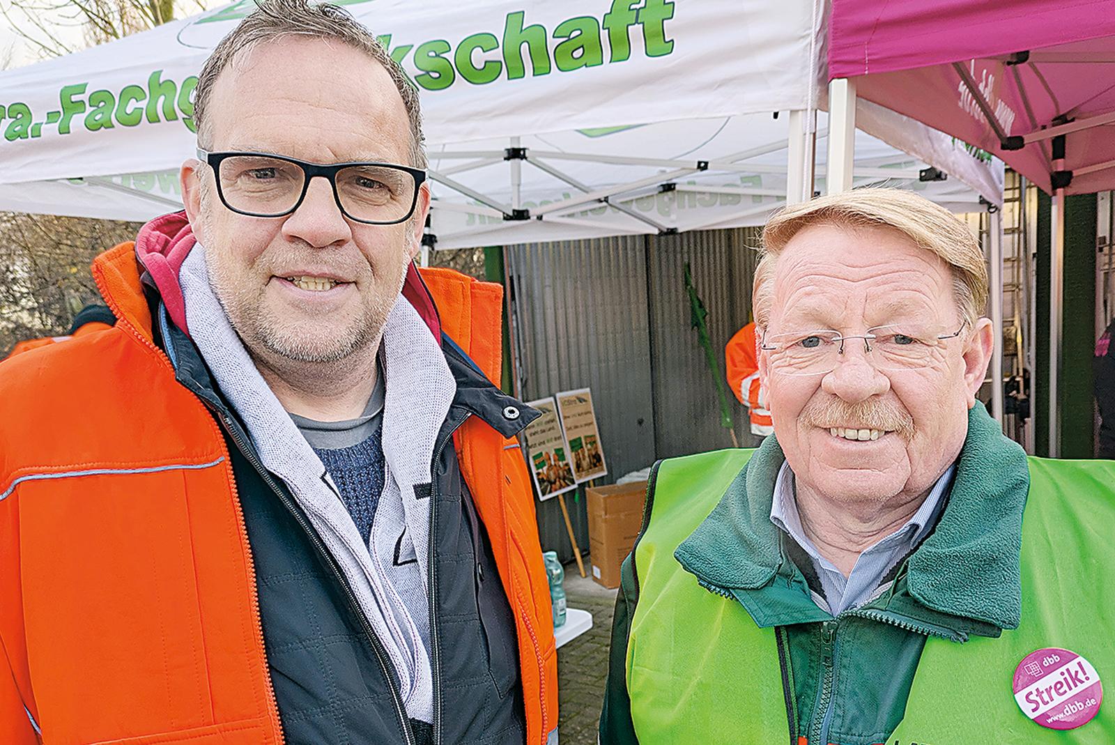Der Landesvorsitzende des Deutschen Beamtenbundes, Alexan­der Zimbel aus Esens (links), und der Bundesvorsitzende Fachgewerkschaft der Straßen- und Verkehrsbeschäftigten, Hermann-Josef Siebigtetroth aus Bad Honnef, beteiligten sich an der Kundgebung auf der Jann-Berghaus-Brücke.  © Fotos: Szyska