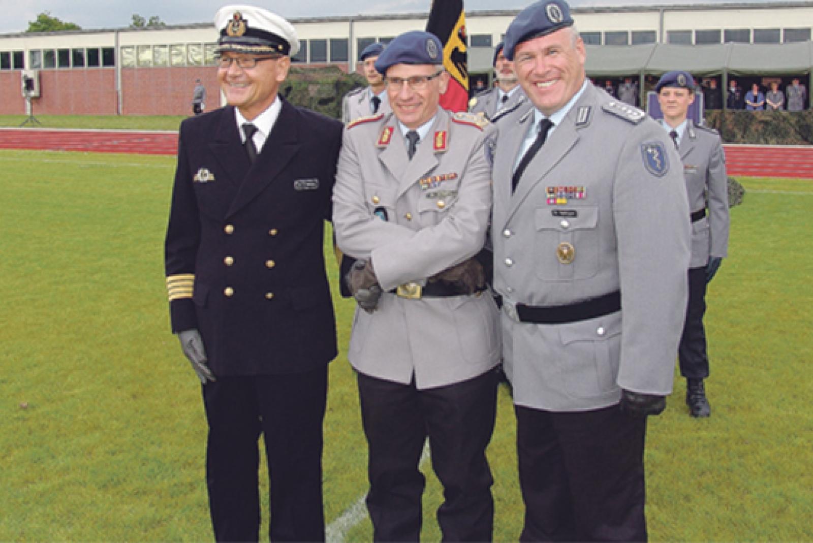 Kommando-Übergabe in der Leeraner Evenburg-Kaserne: Dr. Dirk Möllmann, Generalstabsarzt Dr. Stephan Schoeps und Oberstarzt Dr. Ralf Hoffmann (von links).  ©