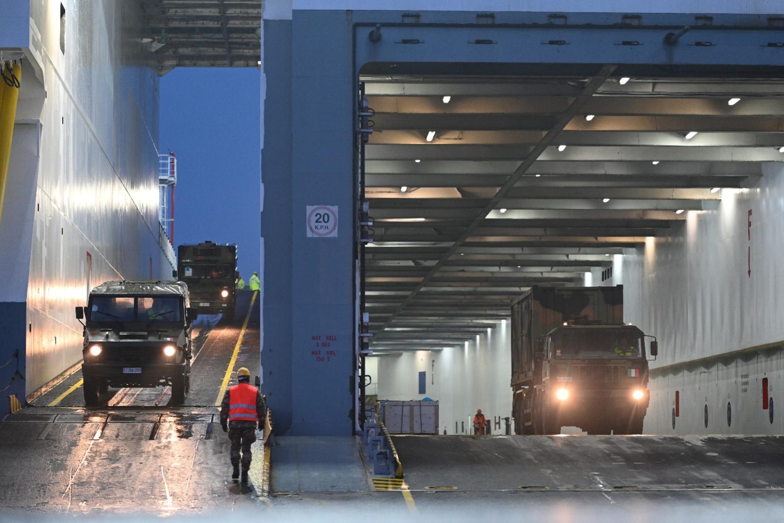 Italienische Soldaten und Soldatinnen treffen mit ihren Ausrüstungen und Fahrzeugen im Emder Hafen ein.  © Foto: Penning (dpa)