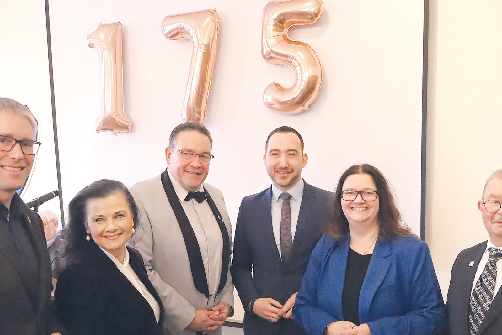 Beim Fest-Empfang (von links): Bürgermeister Heiko Abbas, die Bundestagsabgeordnete Gitta Connemann, der »Harmonie«-Vorsitzende Detlef Troff, der Landtagsabgeordnete Nico Bloem, die Bundestagsabgeordnete Anja Troff-Schaffarzyk und Chorverband-Vizepräsident Diethelm Sempell. © Foto: Ammermann