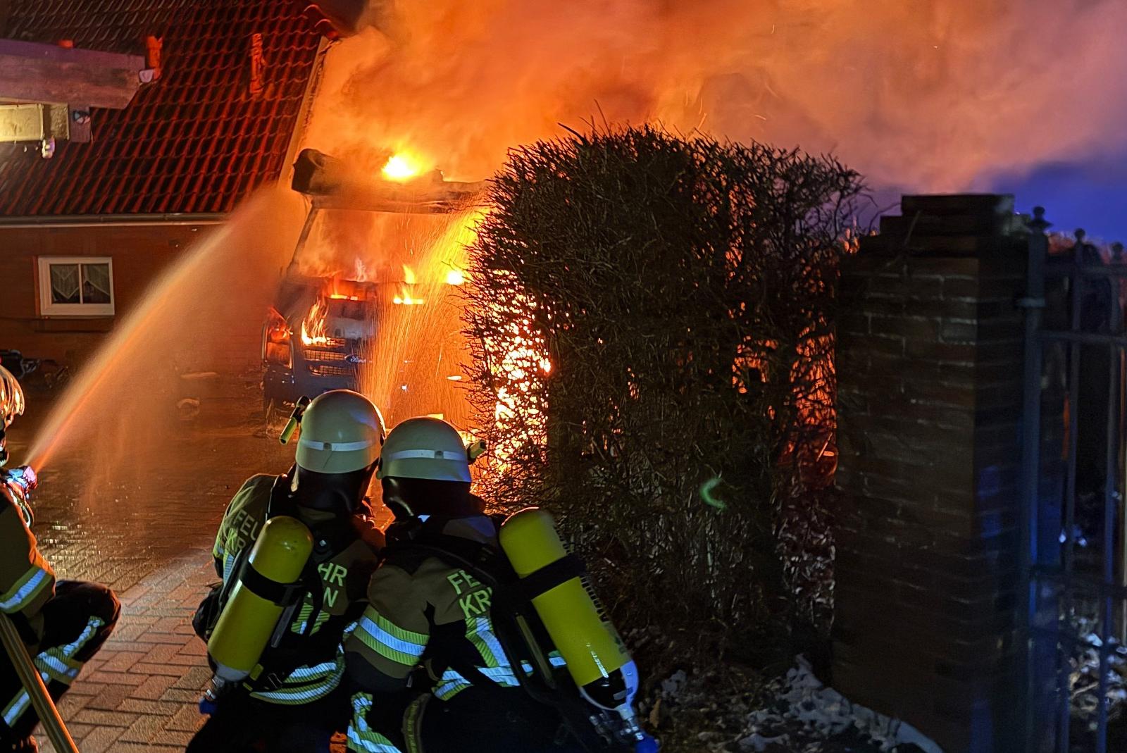 In der Nacht zu Sonntag ist in Visquard im Landkreis Aurich ein Wohnmobil in Brand geraten. Die Feuerwehr wurde um 1.35 Uhr alarmiert. Beim Eintreffen der ersten Einsatzkräfte stand das Fahrzeug bereits in Vollbrand. Aufgrund der unmittelbaren Nähe zu einem Wohngebäude bestand die Gefahr eines Übergreifens der Flammen, teilt die Feuerwehr mit.