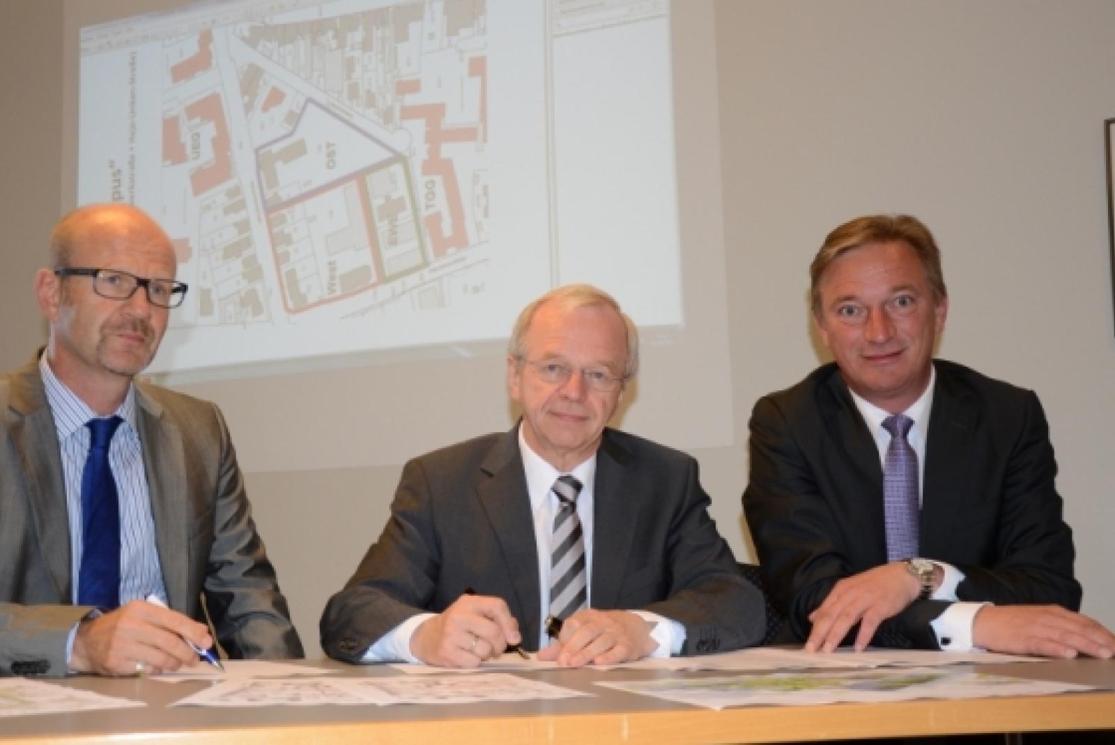 Grundstein für die »Bildungsbaustelle«: EWE-Vorstandsvize Matthias Brückmann (rechts) und Landrat Bernhard Bramlage (Mitte) unterschreiben den Kaufvertrag für den ersten Teil des EWE-Geländes. Links: Hans Beier von der Rechtsabteilung der EWE. © Foto: Hanken