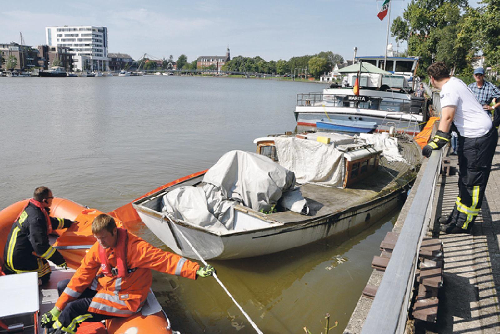 Feuerwehr verlegt Ölsperre um Schiff im Hafen von Leer