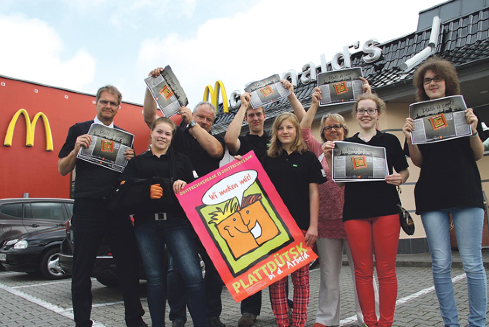 Die Organisatoren der Plattdeutsch-Aktion bei McDonalds mit den entworfenen Tablettauf­lagen. © Foto: Schaller