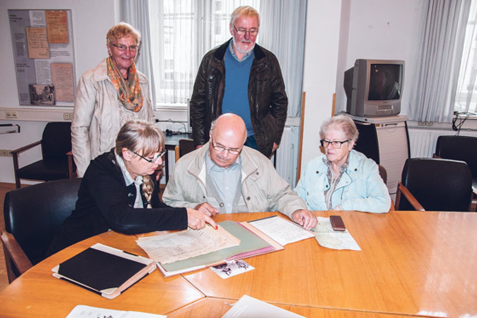 Zum ersten Mal konnten Dieter Pahlau (vorne, Mitte) und seine Schwester Ursula (rechts) mehr über den Tod ihres Vaters erfahren. Archivarin Menna Hensmann (vorne, links) überreichte ihnen die Dokumente. Begleitet wurden sie von Karla und Johann Janssen (hinten). © Foto: de Winter
