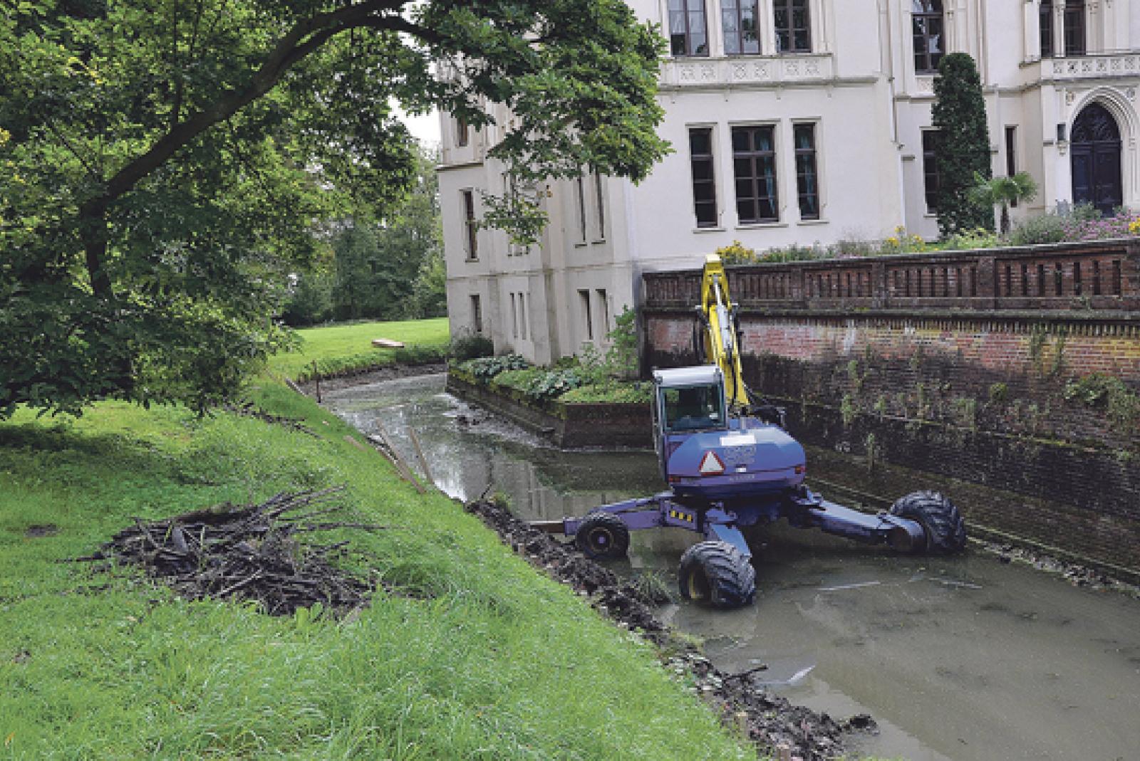 Der Spezialbagger steht derzeit ungenutzt im Schlossgraben der Evenburg. Nachdem bei Böschungsarbeiten geringe Mengen von Gewehrmunition gefunden wurden, soll der Bereich zunächst von einer Spezialfirma untersucht werden. © Foto: Wolters