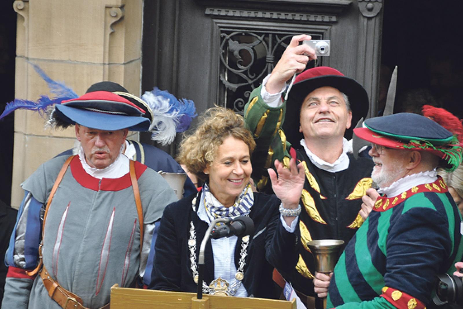 Platt-Premiere: Bürgermeisterin Beatrix Kuhl im Kreise der Gallimarkt-Herolde Franz Krämer, Helmut Kock und Hans-Arno Loerts (von links). © Foto: Wolters