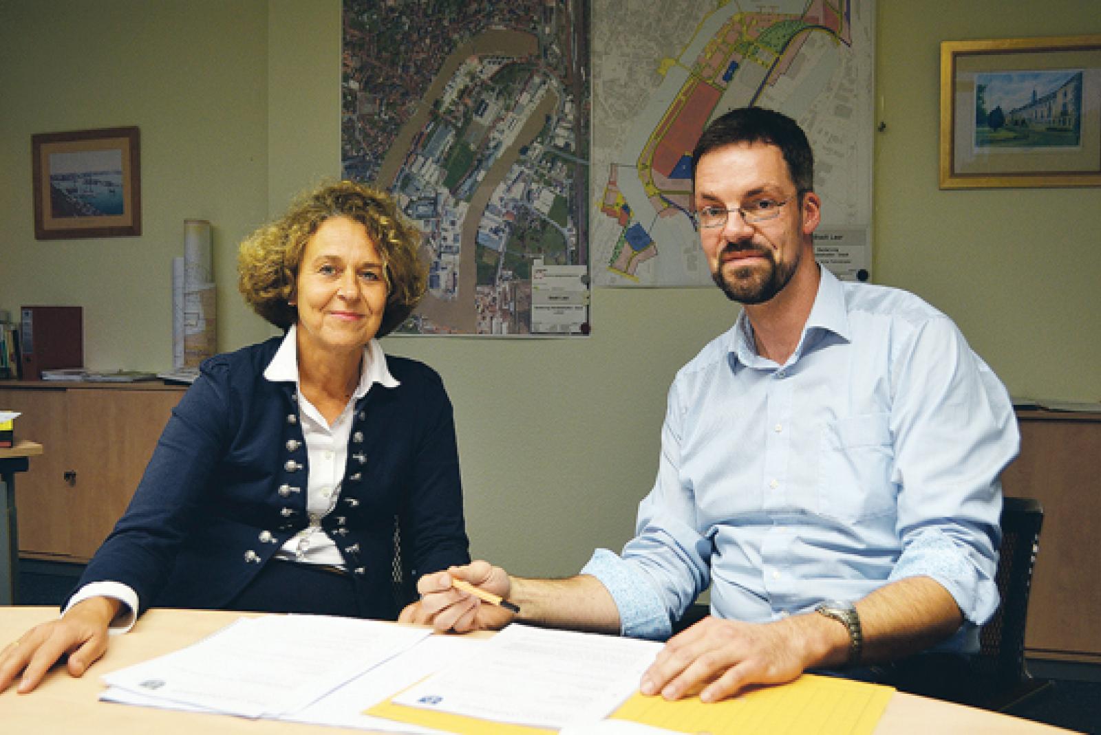 Bürgermeisterin Beatrix Kuhl und der Leiter des Fachdienstes Gebäude- und Energiemanagement, Jens Lüning. © Foto: Stadt Leer