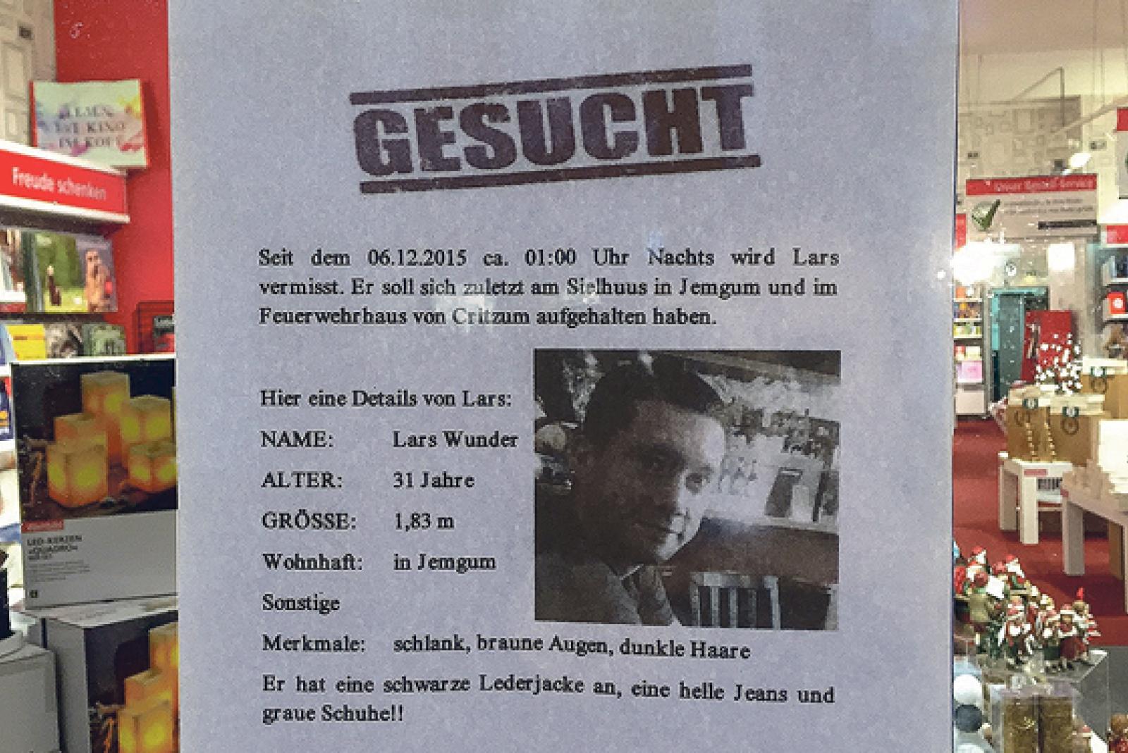 In Jemgum wird es heute eine großangelegte Suchaktion der Feuerwehren aus Bunde, Jemgum und Weener nach dem seit der Nacht zum 6. Dezember vermissten 31-jährigen Lars Wunder geben.