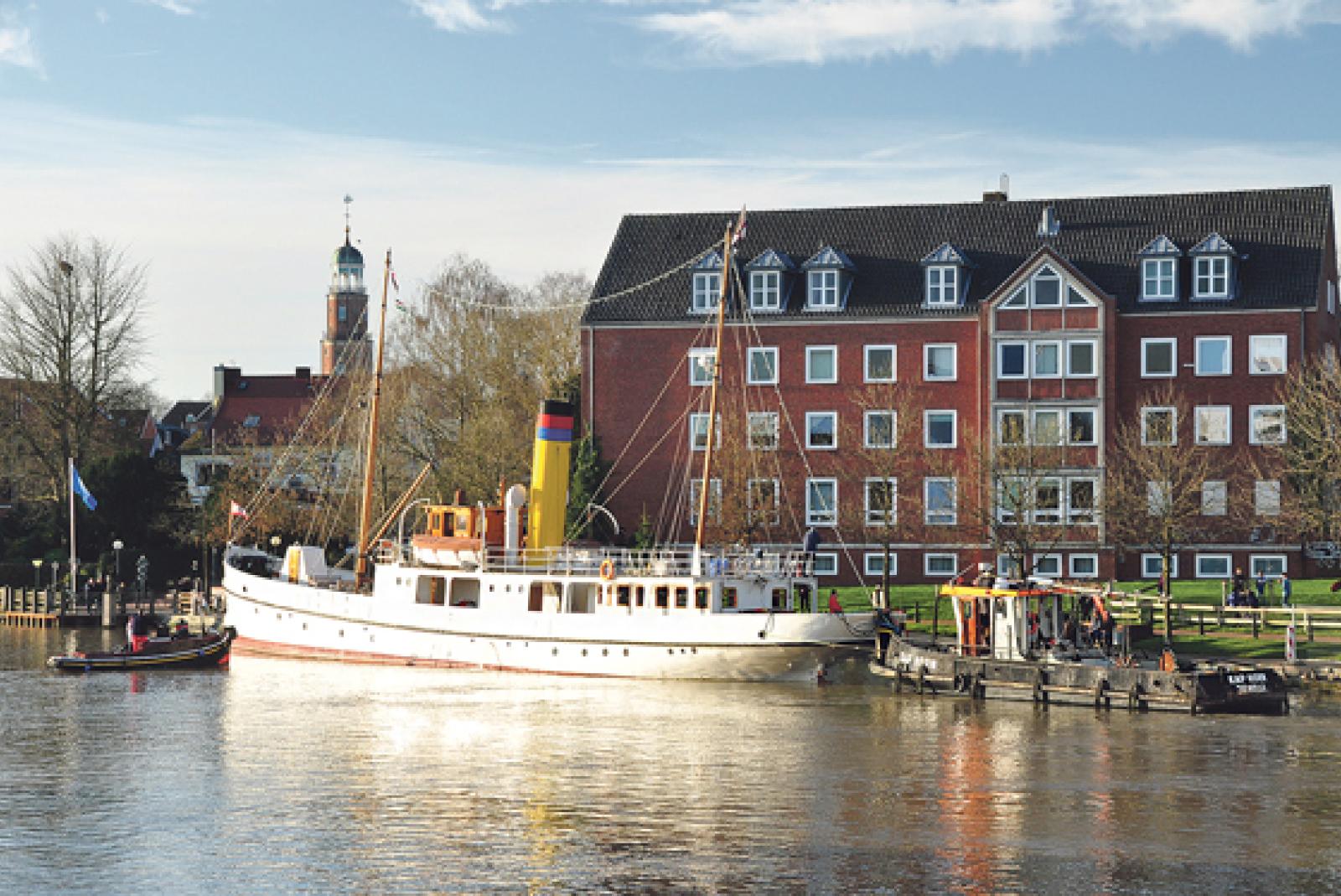 Schiff liegt noch einige Tage an Uferpromenade im Leeraner Hafen