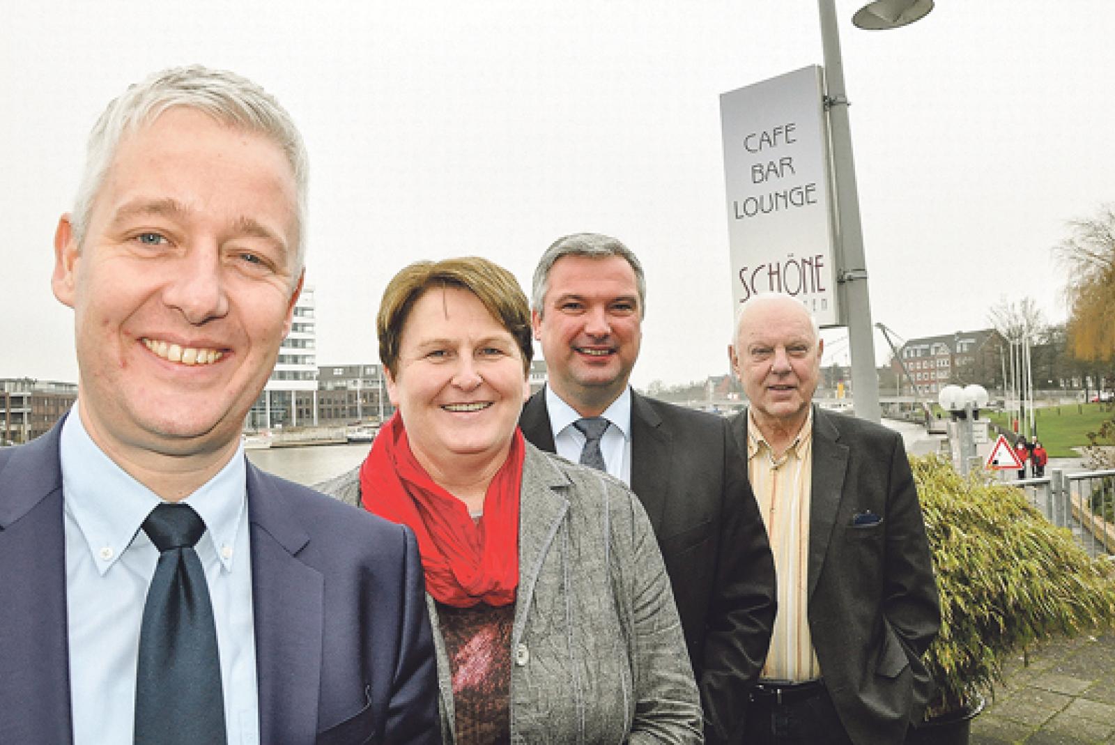 Matthias Groote (vorne) kann sich bei seiner Kandidatur als Leeraner Landrat auf die Rückendeckung von, Johanne Modder (SPD-Landtags­abgeordnete), Sascha Laaken (SPD-Kreisvorsitzender) und Horst Kuhl (SPD-Kreistagsfraktionschef) verlassen. © Foto: Boelmann