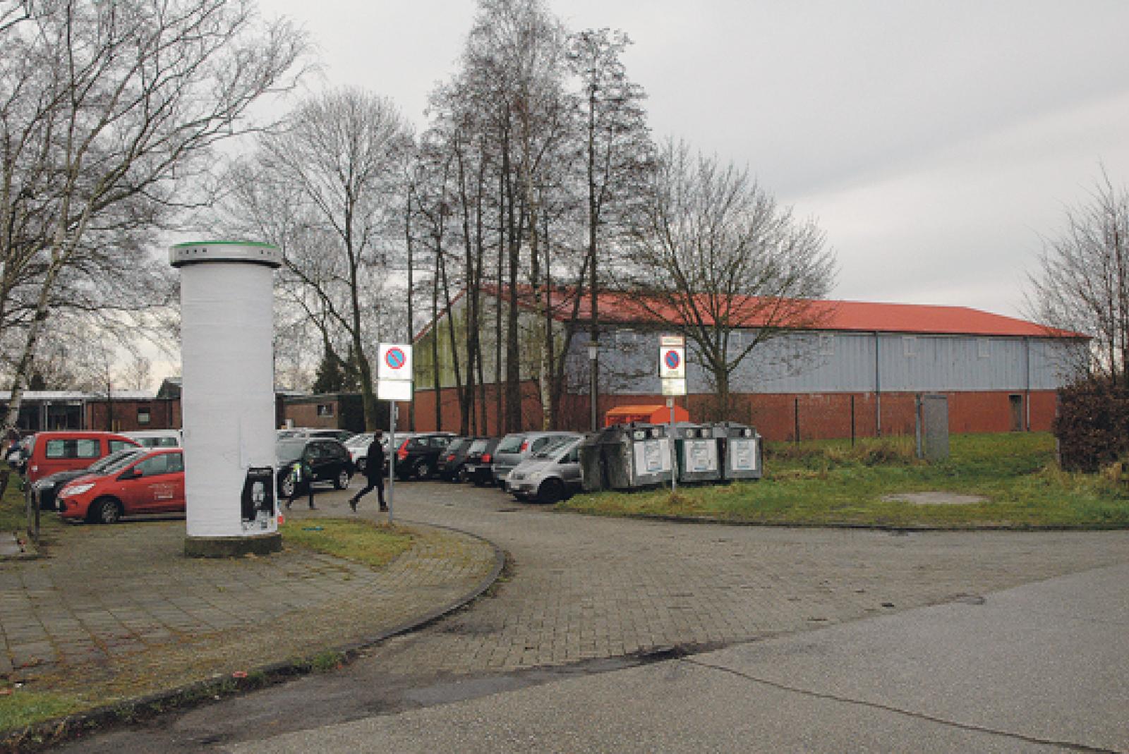 Weniger Pkw-Stellplätze durch Kreisel - gepflasterte Fläche neben der Sporthalle