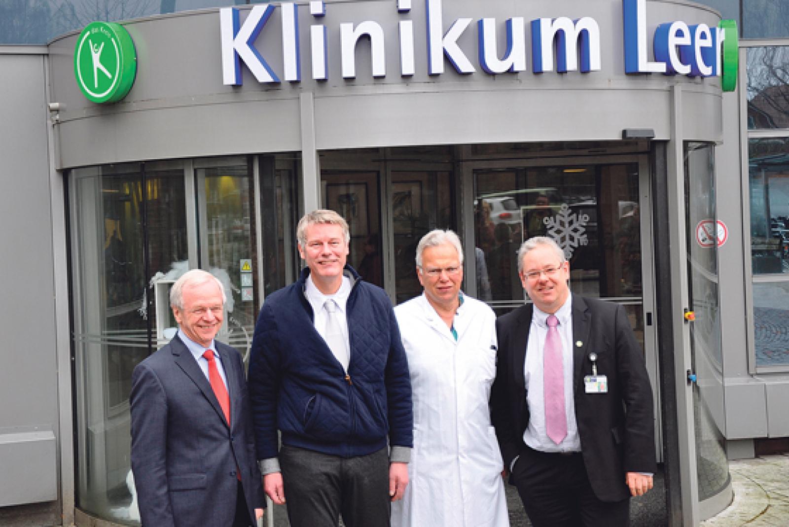 Freuen sich auf die gemeinsame Zusammenarbeit (von links): Landrat Bernhard Bramlage (Aufsichtsratsvorsitzender Klinikum Leer), Dr. Thomas Lübbers (Chefarzt der Klinik für Wirbelsäulenchirurgie), Dr. Hans-Jürgen Wietoska (Ärztlicher Direktor Klinikum Leer) und Holger Glienke (Geschäftsführer Klinikum Leer). © Foto: Klinikum Leer
