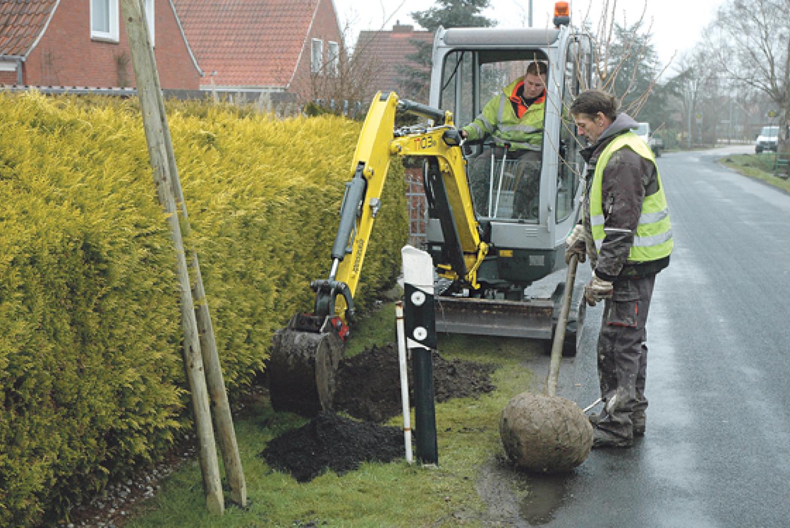 Neben 127 Linden sowie 30 Säuleneichen werden auch 13 Obstbäume in Bingum angepflanzt. Der ursprüngliche Alleecharakter der Ziegeleistraße wird wieder hergestellt. Mitarbeiter des Garten- und Landschaftsbau-Firma »Müller & Aeissen« aus Bunde sorgen pünktlich vor dem Frühling ...