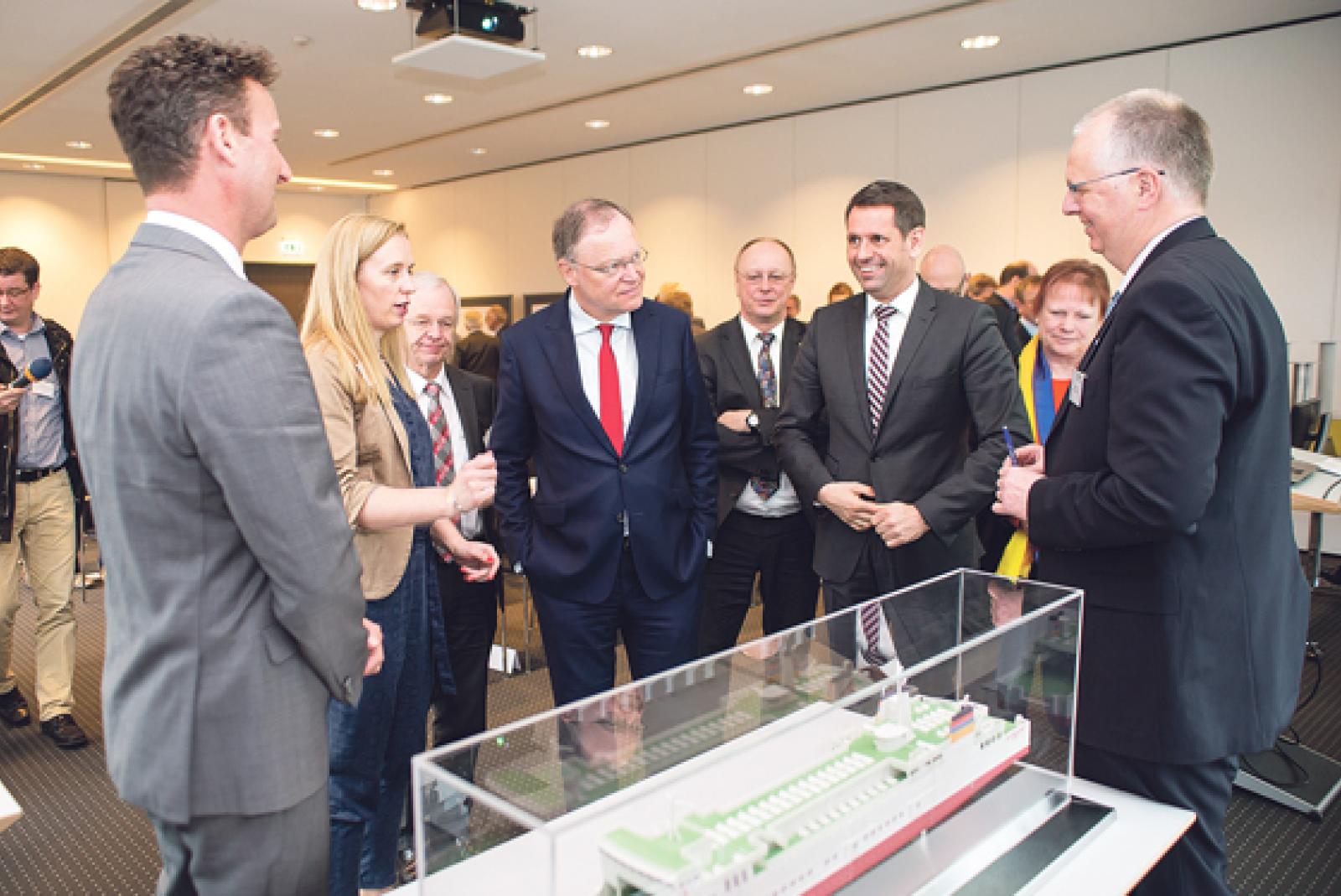 Sprachen in Leer über LNG-betriebene Schiffe (von links): Leo van der Burg, Katja Baumann, Bernhard Bramlage, Ministerpräsident Weil, Michael Ippich, Minister Olaf Lies, Staatssekretärin Almuth Kottwitz und Freek Meyer. © Foto: Jürgen Bambrowicz