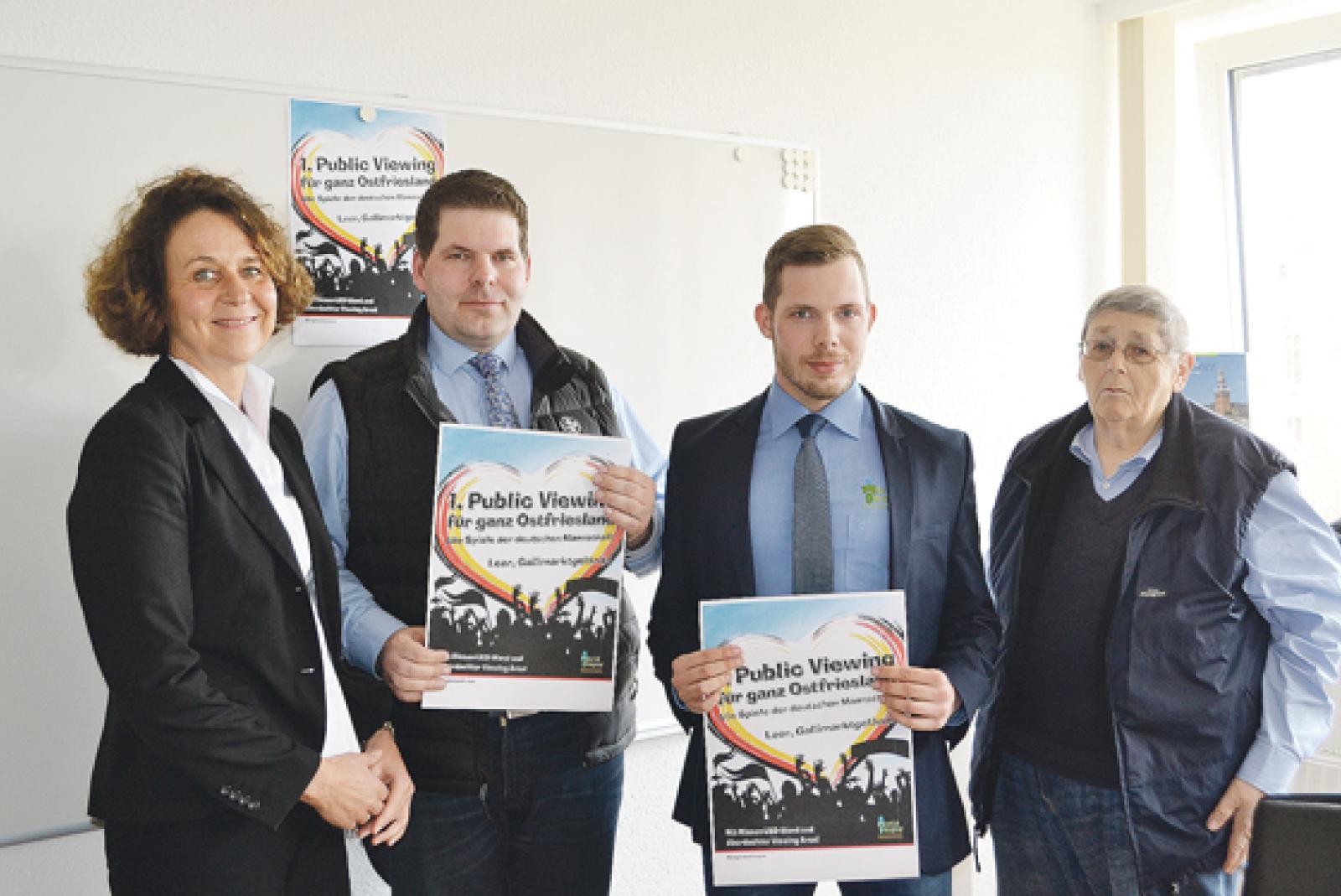 Freuen sich auf eine positive Stimmung beim Public Viewing (von links): Die Leeraner Bürgermeisterin Beatrix Kuhl mit den Veranstaltern Ekko Gosch und René Schwinning und deren Berater Karl Fischer. © Foto: Stadt Leer