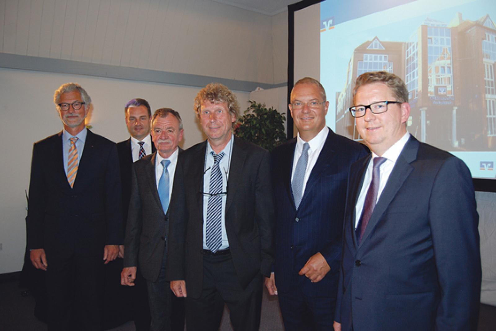 Zufriedene Gesichter bei der OVB-Spitze. Im Bild von links Aufsichtsratsvorsitzender Folkmar Ukena, Georg Alder, das verabschiedete Aufsichtsratsmitglied Eberhard Schröder, Gastreferent Dr. Bernd Raffelhüschen, Vorstandsvorsitzender Holger Franz und das neue Vorstandsmitglied Joachim Fecht. © Foto: Hoegen