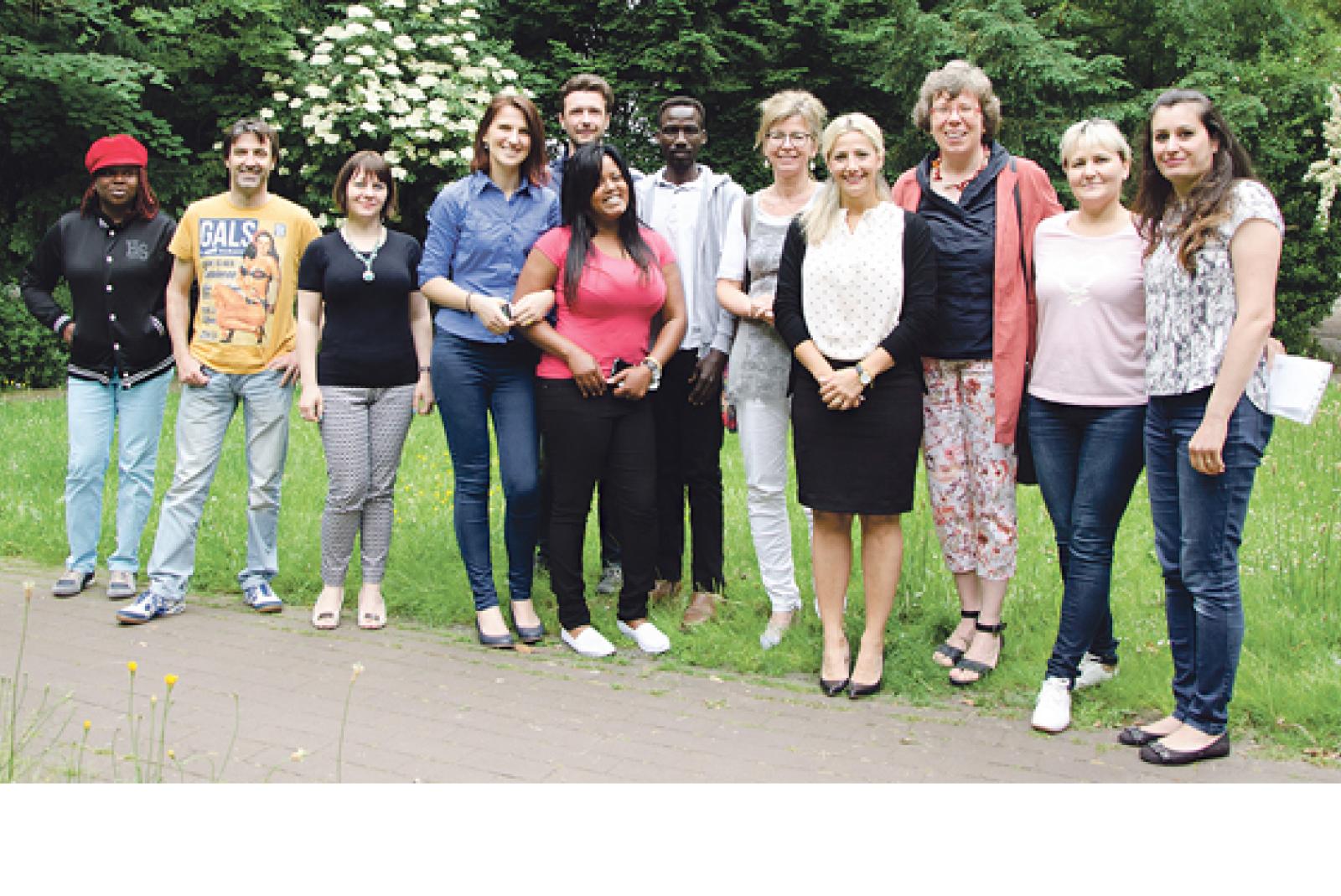 Freude über den Abschluss: Absolventen des Kurses zur berufsbezogenen Sprachförderung mit VHS-Leiterin Heike-Maria Pilk (5. von rechts) sowie den Dozentinnen Teona Wurpts (4. von rechts) und Ursula Behrends (3. von rechts).  © Foto: Volkshochschule