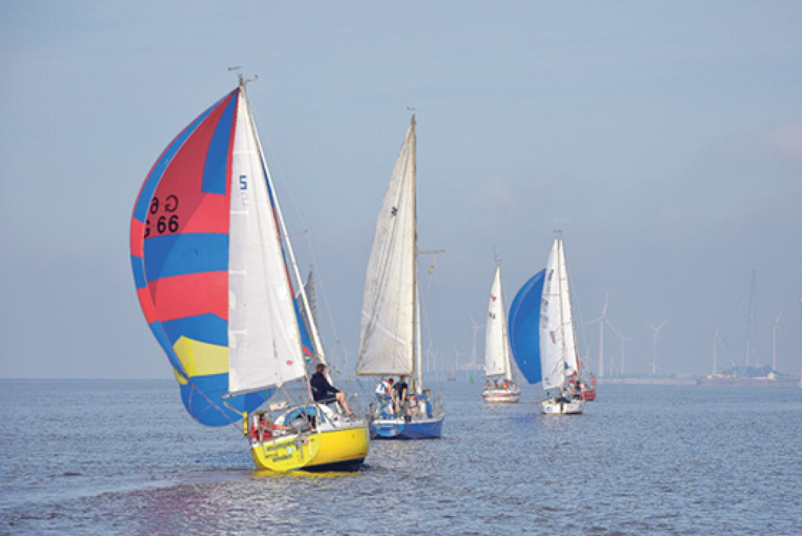 17 Schiffe beteiligten sich an der Regatta. Die schnellste Crew braucht gut sieben Stunden für den Törn. Vom Kutter »Roter Morgen« ertönt um 8.50 Uhr das erste Signal. Die letzten Minuten bis zum Start laufen. Vor der Ditzumer Hafeneinfahrt ...
