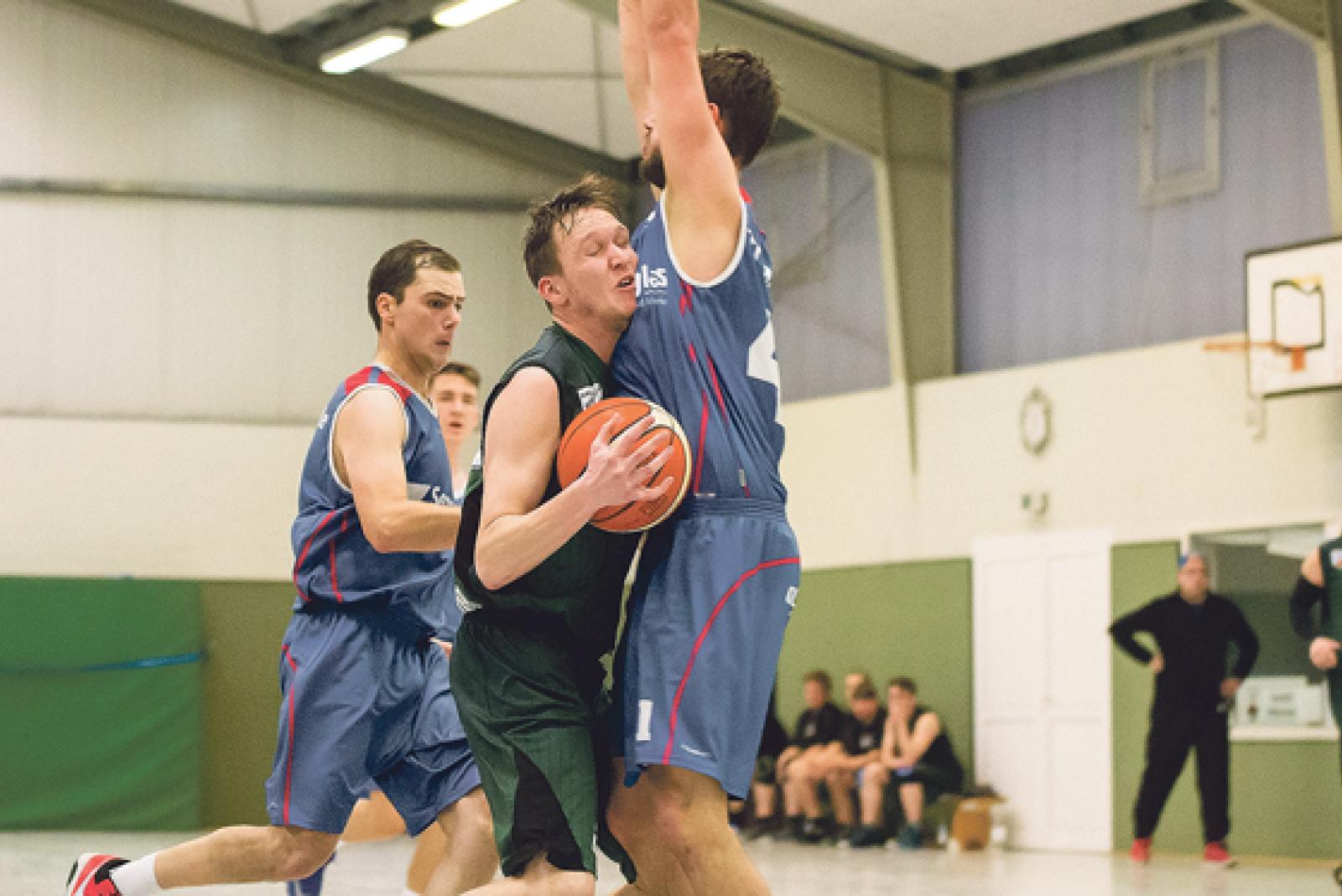 Abgeprallt an der Defensive des VfL Rastede II sind die Basketballer des BSV Bingum. Hier macht Patrick Barghoorn unliebsame Bekanntschaft mit Julian Haase. © Foto: Mentrup