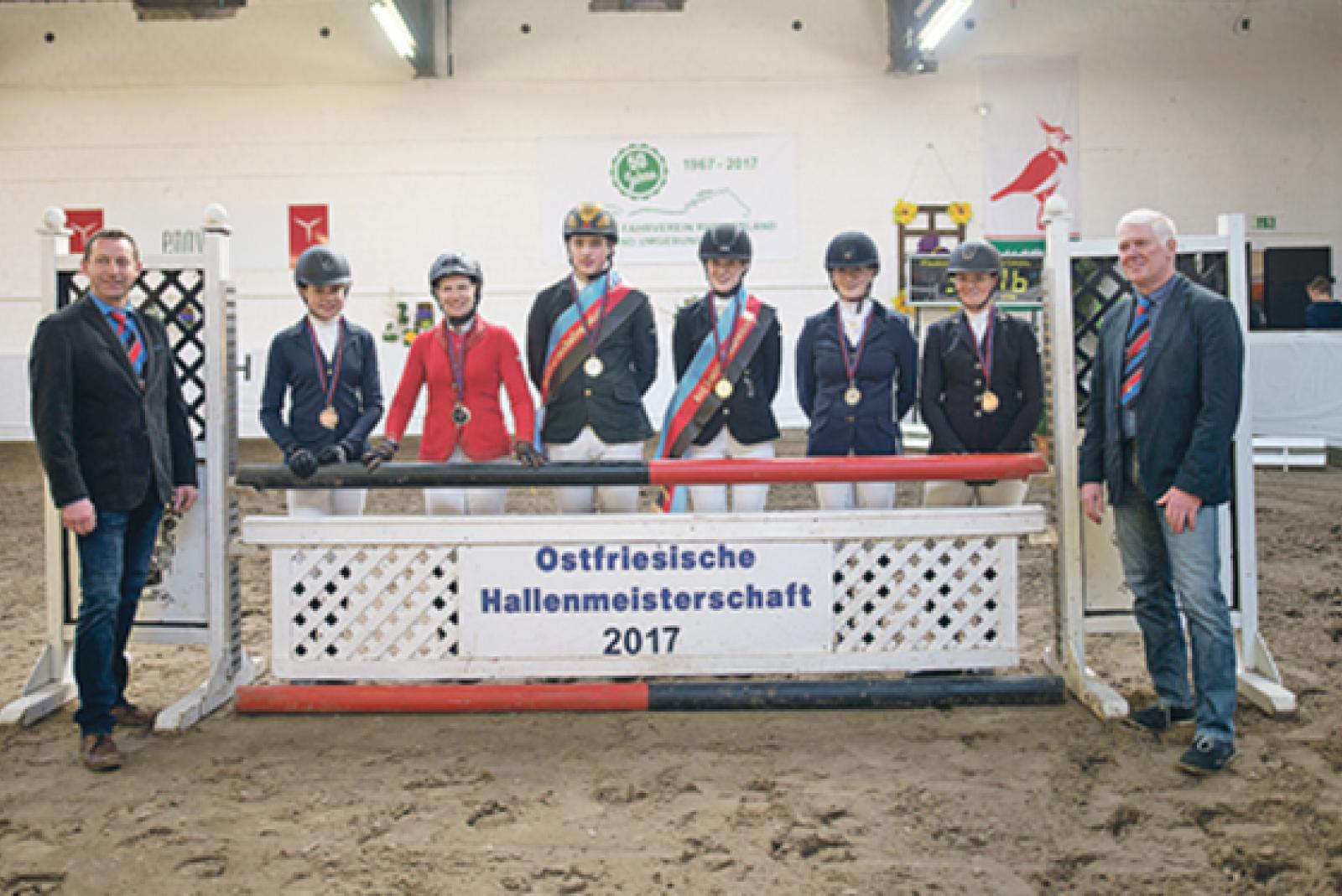Erinnerungsfoto: RuF-Chef Sander Lübbers (ganz links) und Rudolf Claasen (Verband der Fahr- und Reitvereine Ostfrieslands, ganz rechts) mit Janne Visscher, Inga Bruns, Marec Dänekas, Kira Weddermann, Wiebky Byl und Anna Alberts (v. l.). ©