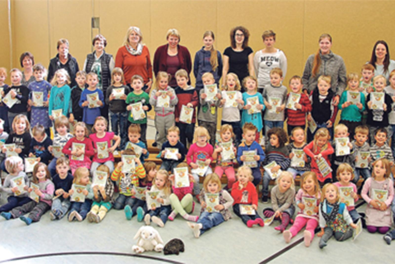 63 Mädchen und Jungen aus dem Kindergarten Stapelmoor haben sich jetzt einer ganz besonderen Aufgabe gestellt: Den Hasen Hoppel und seinen Freund, den Igel Bürste, haben sie auf dem Weg durch den Eichenwald zu ihrer Freundin Frau Eule begleitet, ...