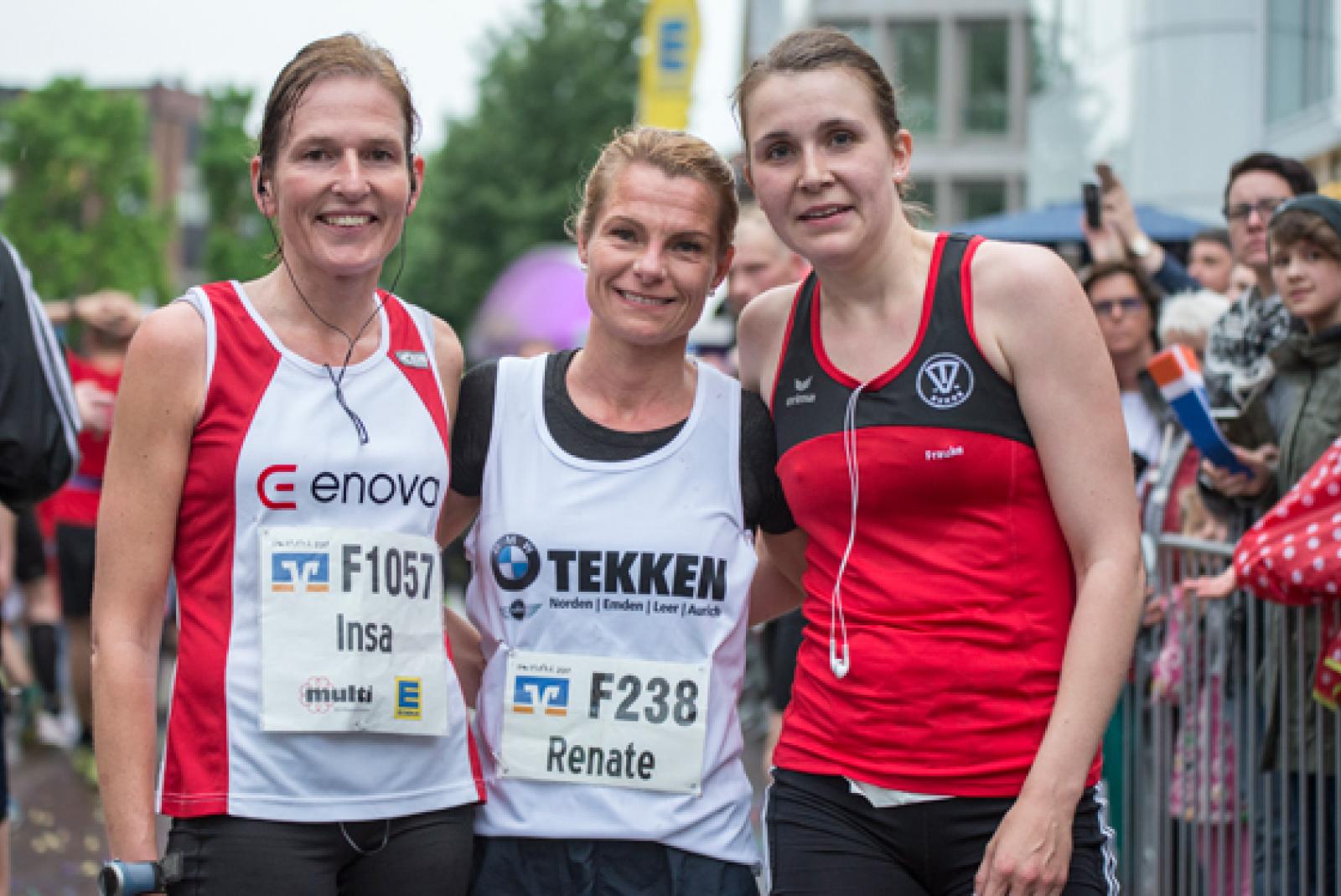 Nass, aber stolz kamen die Ostfrieslandläufer in Leer an. Der Gesamtsieg bei den Frauen ging an Renate Kramer von der LG TV Bunde, die gemeinsam mit Insa Franzen und Frauke Buntjer auch in der Teamwertung vorn lag.