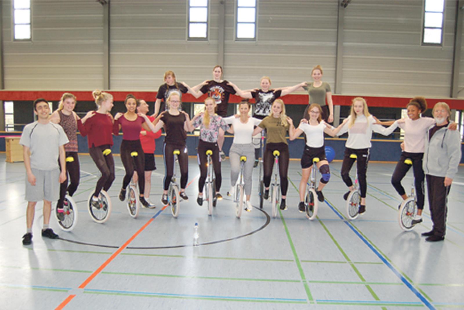 Ihr Glück auf dem Einrad versuchte auch Gitta Connemann (Mitte) bei ihrem Besuch bei »Akeitu«. Sie hat die neue Choreographie bereits gesehen, bei der öffentlichen Generalprobe am Freitag haben auch alle anderen Interessierten die Möglichkeit dazu. © Foto: Sempell