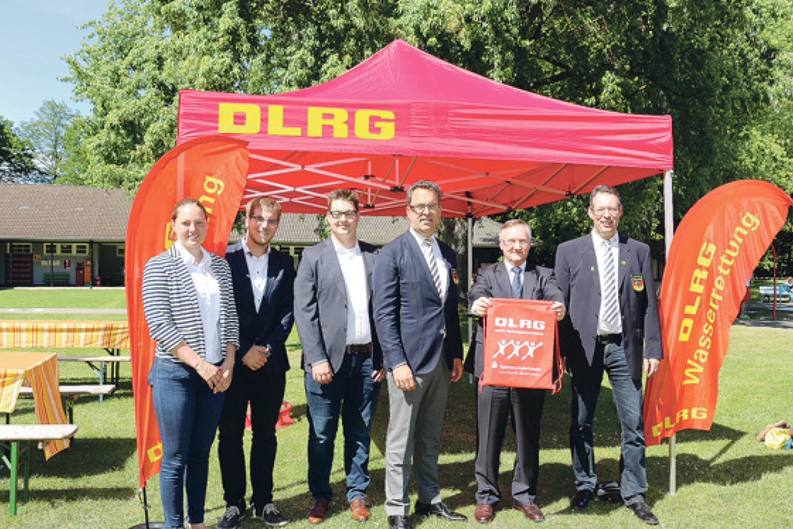 Arbeiten gemeinsam für mehr Sicherheit im Wasser: (v. l.) Sari-Angès Sieg (Vizepräsidentin des DLRG-Landesverbandes Niedersachsen), Henning Dreyer, Onno Peters (beide vom Jugendvorstand der DLRG Weener), Dr. Oliver Liersch (Präsident des DLRG-Landesverbandes Niedersachsen), Günter Distelrath (Verbandsgeschäftsführer des Sparkassenverbandes Niedersachsen) und Norbert Loger (1. Vorsitzender der DLRG Weener). © Foto: privat