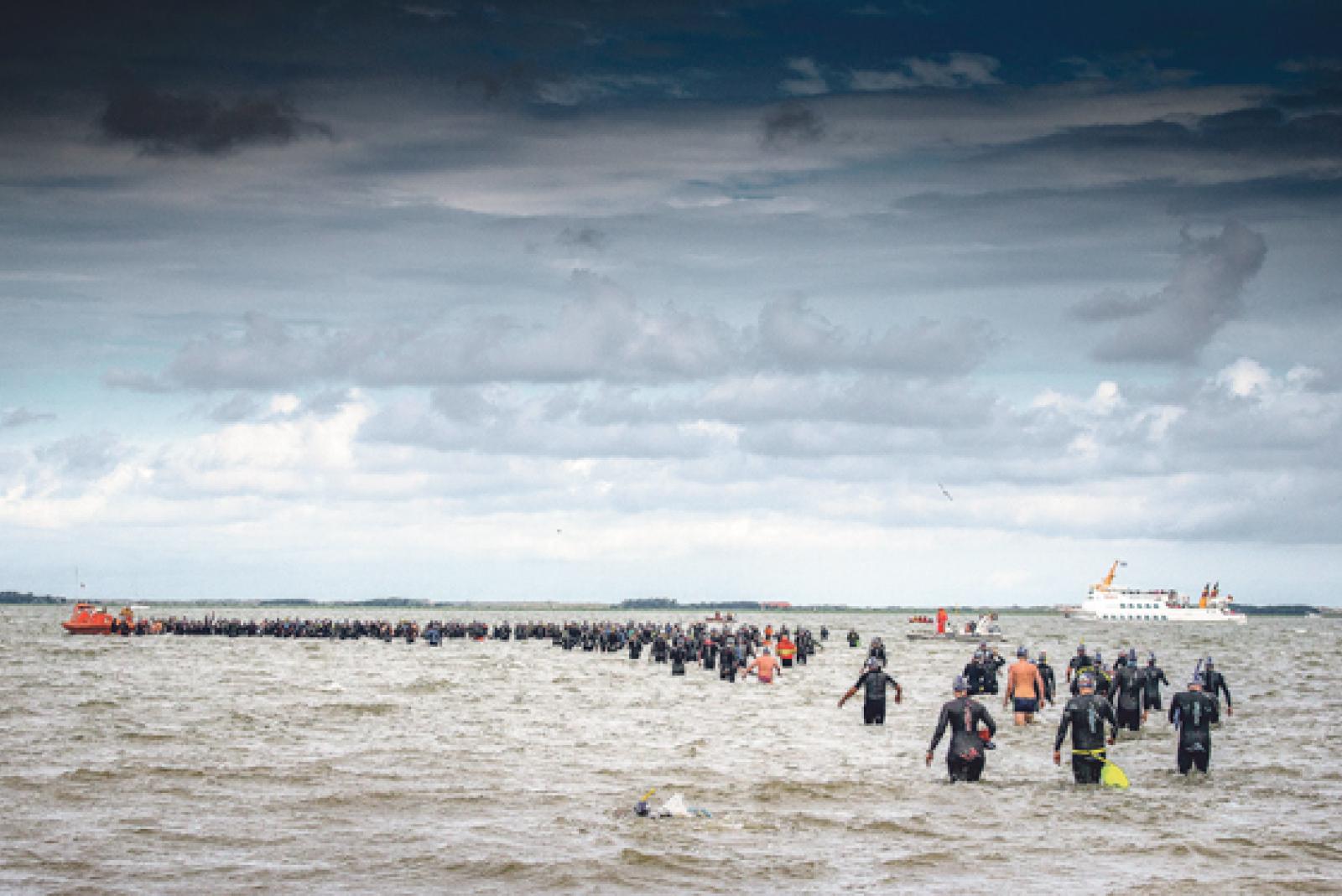 Auf dem Weg zum Start: Bei Hilgenriedersiel begleiteten die Schwimmer einige dunkle Wolken . © Foto: König Event Marketing