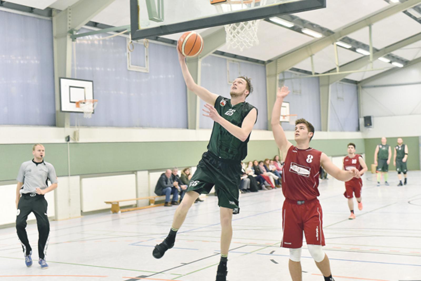Nicht zu bremsen auf dem Weg zum Korb ist Bingums Patrick Barghoorn in dieser Szene. Er steuerte 19 Punkte zum deutlichen Bingumer Sieg bei. Brakes Jacob Nafzger kann dem Rheiderländer nur noch hinterherschauen. © Foto: Bruins
