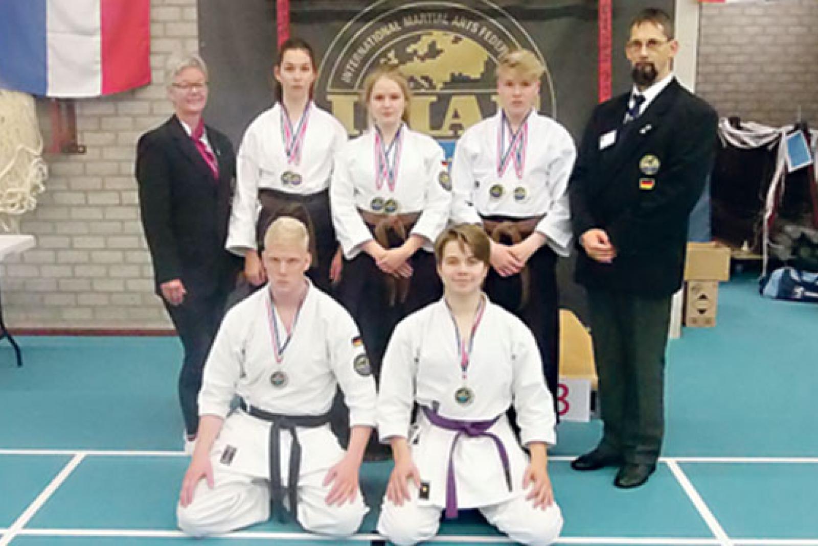 Die beiden Trainer Antine Hoppen (links) und Wolfgang Hermann (rechts) begleiteten die Karateka (oben, von links) Lena Lüürsen, Jana Willems, Thorben Gosling, (unten, von links)Jann Lübbers und Dennis Staal. © Fotos: privat
