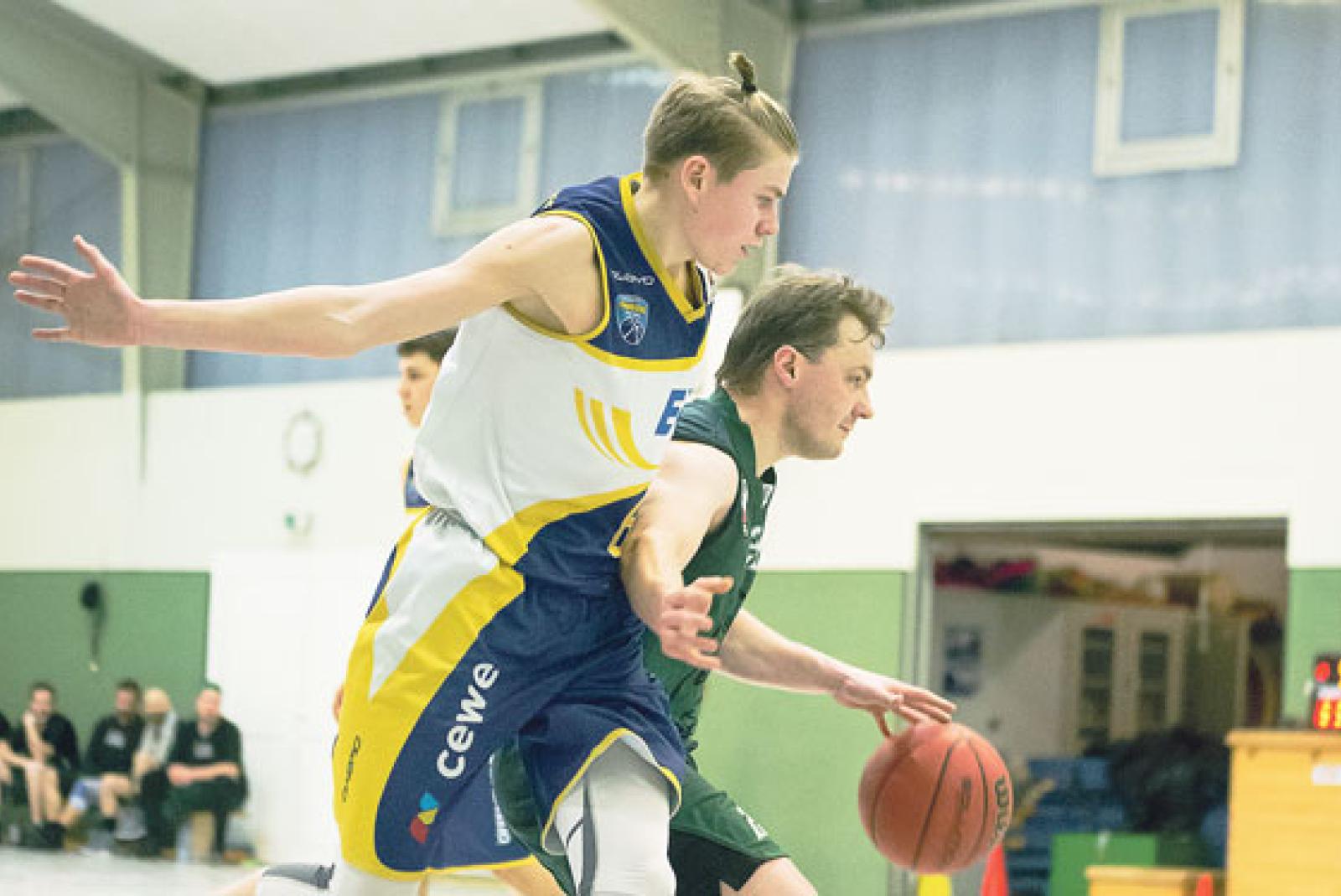 Abgeblockt: Bingums Dennis Thiems hält sich seinen Oldenburger Gegenspieler vom Leib. Der BSV war am Samstag die deutlich bessere Mannschaft und siegte verdient. © Foto: Mentrup