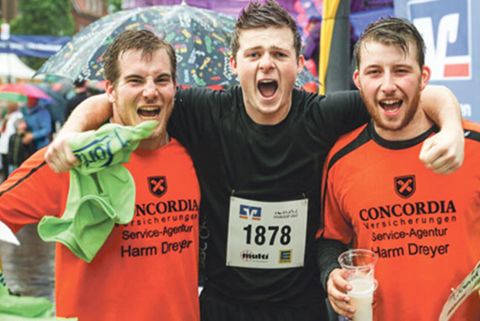 Klitschnass aber glücklich: Nach dem Zieleinlauf in Leer freuten sich im Mai 2017 (von links) Henning Dreyer, Marco Dreesmann und Frank Schulte über den Titel »Dörlooper«. © Archivfoto: Schulte
