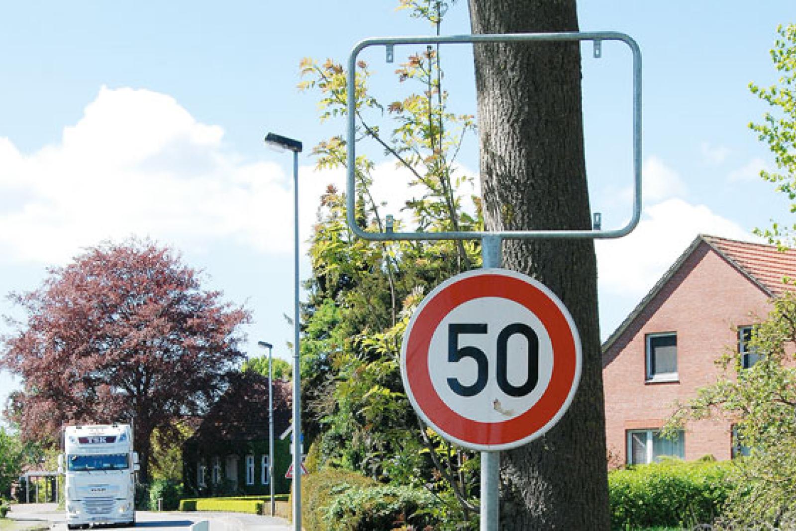 Das gelbe Ortsschild steht sonst am Ortseingang auf der rechten Seite der Hauptstraß...