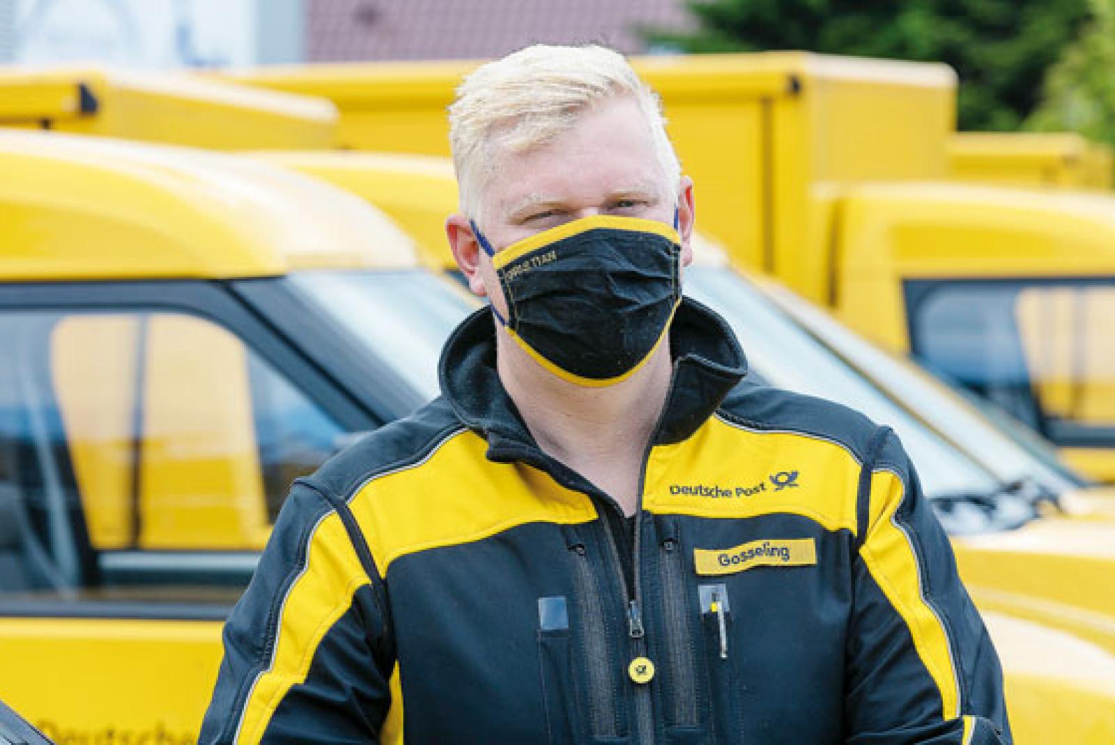 Christian Gosseling trägt seine Mund- und Nasenmaske in den Farben der Post