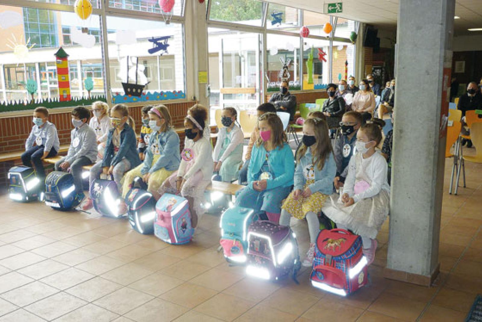 ABC-Schützen mit Ranzen und Maske bei der Einschulungsfeier in Weener