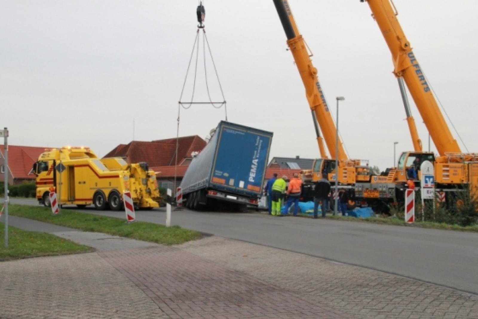 Diese Bergungsaktion sorgte gestern in Jemgum für großes Aufsehen. Ein Sattelzug war um 8.25 Uhr auf der Hofstraße in Jemgum (Landesstraße 15) in einer Linkskurve nach rechts von der Fahrbahn abgekommen und auf Höhe des Edeka-Marktes im ...