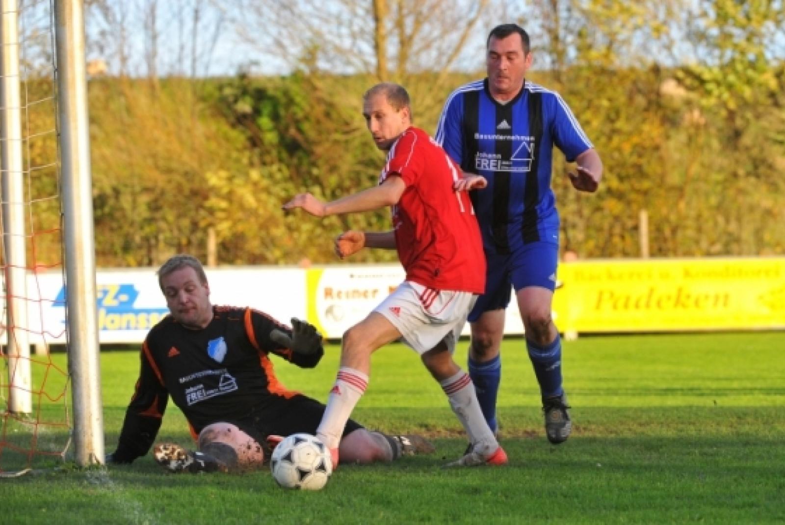 Ausnahmsweise mal nicht drin ist der Ball in dieser Szene: Verlaats Keeper Andre Buß kann gegen Klaas Tielemann klären. © Foto: Bruins