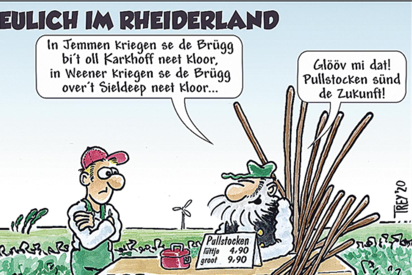 Not macht erfinderisch - dachte sich auch RZ-Karikaturist Thomas Trey. Seine Idee: Da die kleinen Brückenprojekte in Weener und Jemgum weiter einer Umsetzung harren, könnten Anlieger vielleicht mit dem bewährten Pulsstock die jeweils anderen Ufer erreichen. Und ...